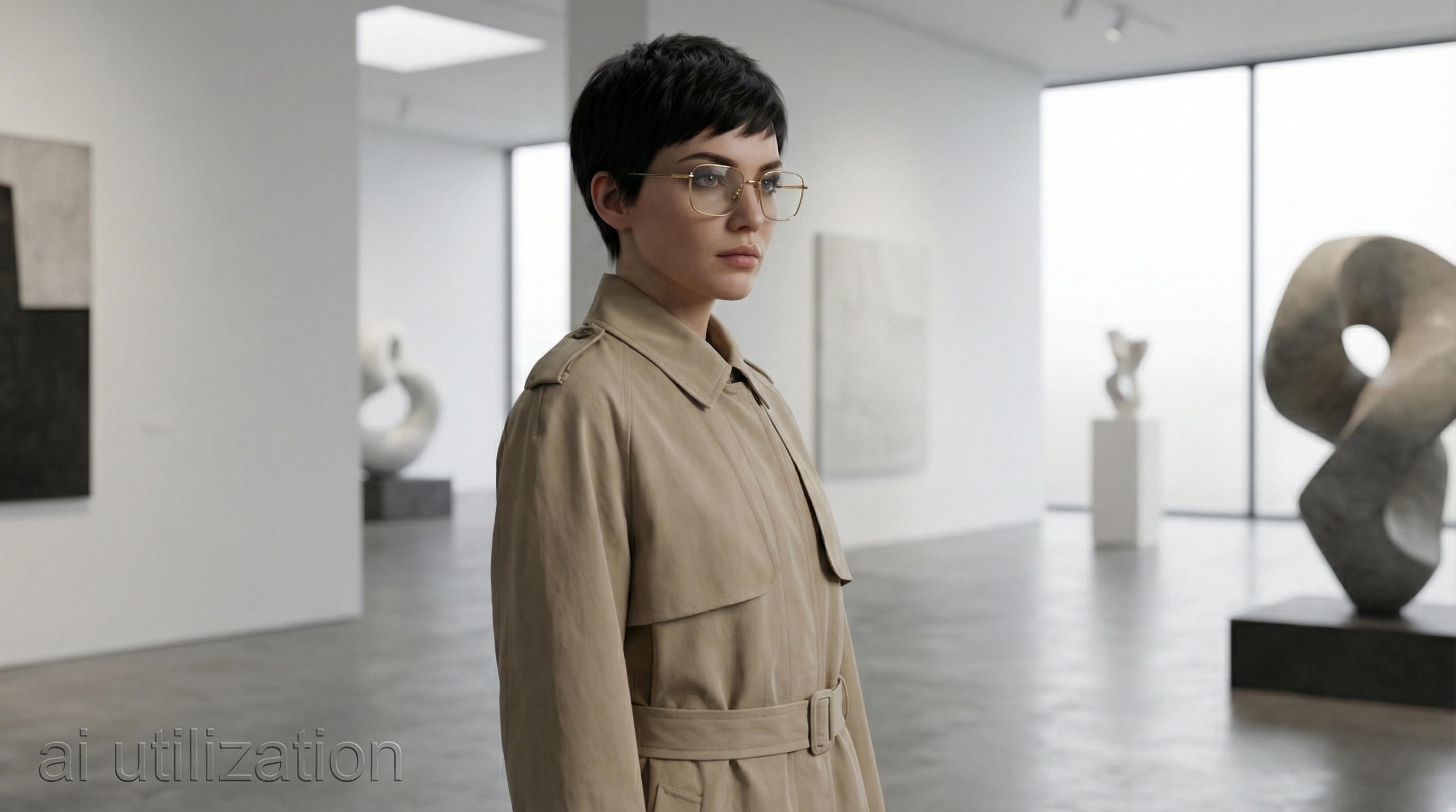 1. 전시회룩의 핵심: 트렌치코트와 메탈 안경의 미학 👓