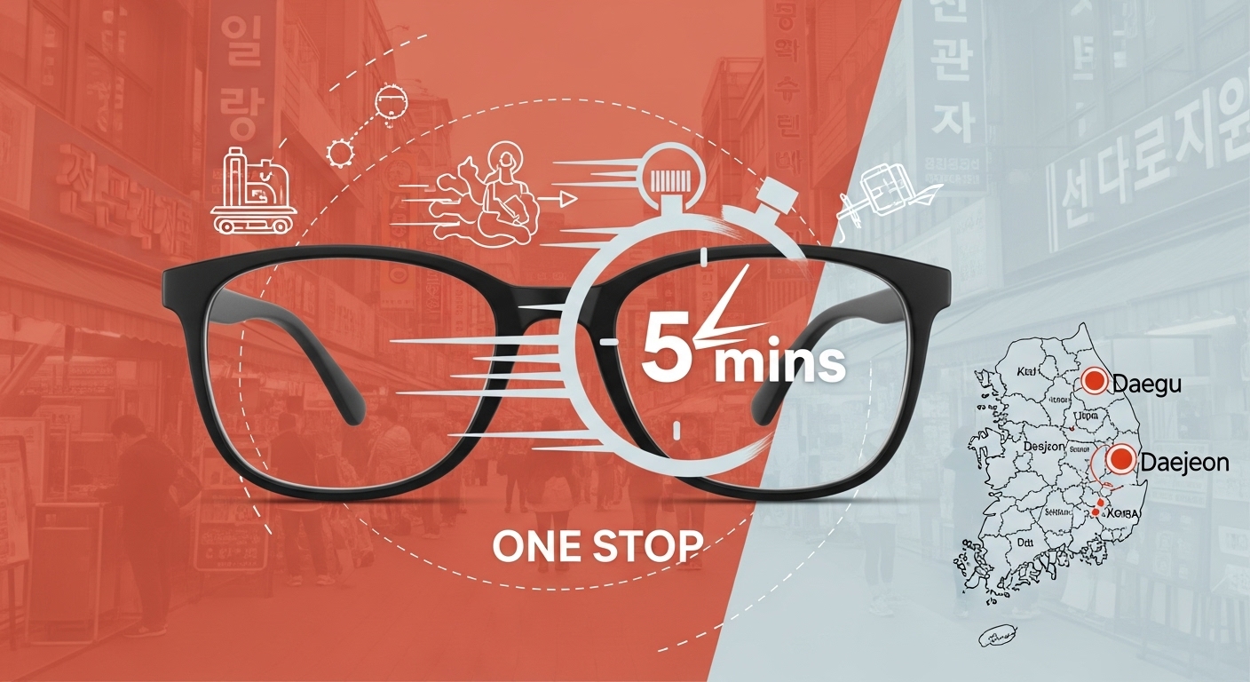 - 과거 제조업 강국의 유산: 한국이 한때 "세계적인 안경 제조국이었다는 점"도 현재의 최고 수준 서비스를 가능하게 한 기반입니다. 특히 대구는 안경테, 대전은 렌즈 제조의 중심지로 80~90년대까지 한국 안경의 가성비는 세계적으로 유명했으며, 안경테는 세계 시장 점유율 2위를 차지하기도 했습니다. 이러한 제조 인프라와 기술력이 현재의 빠르고 정확한 제작 서비스로 이어진 것입니다.